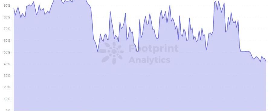 FootprintAnalytics-AverageGasPrice網絡使用率雖然在gas價格上沒有降低,但倫敦升級會使基礎費用變得可預測。gas費的價格會根據區塊使用率的上升而增加,當使用率降低時價格也會減少。回溯以太坊自倫敦升級后,網絡使用率發生了巨大的下降。由原來約97%下降到51%左右,并且使用率非常穩定,浮動基本不超1%。
