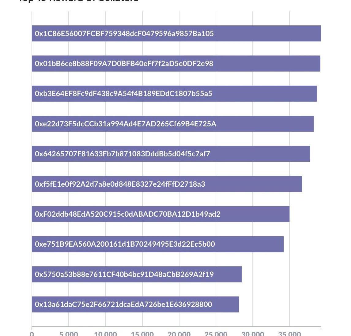 這個圖是近20個round,所有委托人的總數。可以看到,委托人相對而言數量非常穩定,穩定在11000左右的總人數。最后我們來看看獎勵的情況,收集人節點收到的獎勵前十名如下圖: