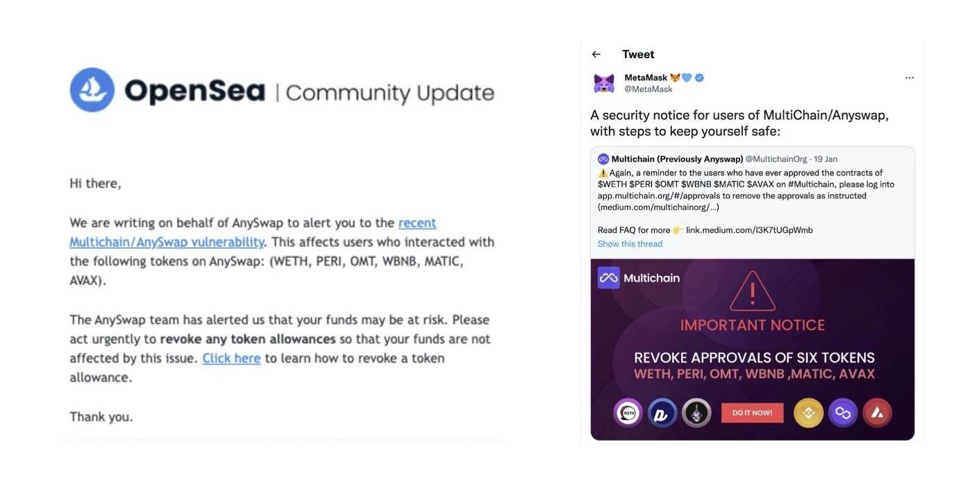 1月10日:在接到Dedaub的報告后,Multichain立即成立了聯合小組,討論并采取了一系列措施保護資金安全。?Multichain檢查了所有代幣合約,發現6種代幣可能存在風險,涉及到其流動性池的漏洞已在24小時內修復。?暫停使用6種代幣的路由器合約。?與合作伙伴共同開展全面檢查,排查受影響的用戶地址。?建立實時監控系統。?開發網頁前端,設置取消授權入口。?創建資產保全合約。?通知用戶取消授權。1月18日:Multichain發布官方公告,敦促受影響的用戶取消授權,并不斷向所有用戶更新事件最新情況。以此同時,Multichain與所有可能的渠道聯系以呼吁用戶立即采取行動保障資金安全,從而最大限度地提高取消授權的用戶比例。