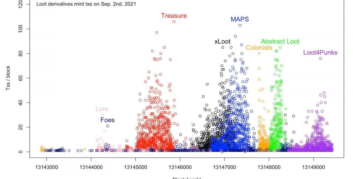 XRP/HKD-2.01%2021年,NFT收藏品爆發成一個數十億美元的資產類別。然而,快速的成功也伴隨著一些“成長的煩惱”。大多數NFTDrop多使用先到先得機制,其固定價格遠遠低于市場價格。那這樣會導致什么問題呢?低價和過度需求有效地創造了競爭條件。在NFTDrop早期,買家的期待值很高,但只有最早的買家才有機會鑄造NFT。因此,哄搶導致對下一個區塊中的鑄造交易的需求上升,Gas費大幅增加。在需求高峰期,就會出現“Gas戰爭”。這在高需求NFTDrop期間給用戶帶來了很糟糕的體驗。比如,在Loot項目取得突破性成功后,急于mint和上市Loot衍生品導致gas費多次飆升,從而提高了整個以太坊網絡的交易價格。下圖顯示了去年9月2日,每當鑄造Loot品衍生品時,gas費是如何大幅上漲的。