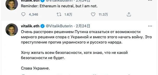 俄烏局勢,牽動各方,加密世界也積極關注事件動態。兩周前,以太坊創始人VitalikButerin用他的母語在推特上呼吁俄羅斯總統普京不要入侵烏克蘭。“對烏克蘭的攻擊只會傷害俄羅斯、烏克蘭和人類。局勢會回到和平道路還是會發生戰爭,現在可以決定的不是澤連斯基,也不是北約,而是@KremlinRussia。我希望他們明智地選擇。”V神稱。在推文中,V神標記了克里姆林宮的推特賬戶@KremlinRussia,但未收到回應。2月24日,V神再次發推表示:“普京決定放棄和平解決與烏克蘭的爭端而選擇開戰,這是對烏克蘭和俄羅斯人民的犯罪行為。我想祝大家平安,雖然我知道現在大家不會感到安全。榮耀歸于烏克蘭。”隨后,他補充說,“以太坊是中立的,但我不是”,表明自己堅定支持烏克蘭的立場。