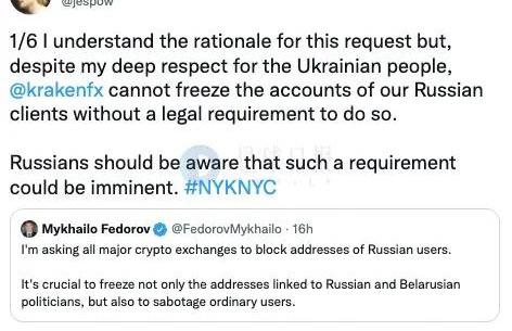 隨著俄烏戰爭的開啟,美國、歐盟等相繼宣布對俄羅斯出臺嚴厲的經濟制裁措施。上周五,俄羅斯被多國從全球支付系統SWIFT中踢出。如今,制裁俄羅斯的浪潮席卷到了加密市場,加密機構又將如何應對?排名第四、擁有全網超過5%算力的以太坊礦池FlexPool首先作出反應。根據公告,該礦池將取消所有來自俄羅斯的IP進行挖礦。“我們向我們的俄羅斯礦工道歉,你們中的許多人不支持戰爭。然而,是你在支持你的國家。沒有人民,俄羅斯就無法運作。只有通過削弱其人民的經濟實力,我們才有機會影響這場戰爭。如果戰爭得到和平解決,我們很高興地歡迎所有俄羅斯礦工回來,我們將用個人資金來彌補你們。”不過,俄羅斯的比特幣挖礦并沒有受到影響。CompassMining首席執行官WhitGibbs表示,該公司在俄羅斯的自有設施“完全與任何地緣動蕩隔絕”,“除非制裁影響到礦池提供者,否則算力不太可能下線”。根據劍橋另類金融中心的數據,截至2021年7月,俄羅斯占全球比特幣算力的11%以上,未來是否會關機停產,仍然是一個未知數。根據彭博社報道,律師事務所的合伙人J.AshleyEbersole認為,所有在美國SEC和FinCEN等任何國家機構注冊并提供貨幣交易服務的中心化加密貨幣平臺,都必須遵守美國的制裁行動。然而,加密交易所對于俄羅斯制裁,響應程度不一。幣安在俄羅斯的交易所代表、律師MariaAgranovskaya說:“到今天為止政府還沒有宣布任何涉及加密貨幣的具體舉措,英國對俄羅斯公民的銀行設置了一定的限制,但這與加密貨幣無關。也許它會在某個時候影響加密貨幣,但不是現在。”幣安方面告訴彭博社:“我們已經組建了一個專門的全球合規工作組,包括世界知名的制裁專家,并正在采取必要的行動,以完全遵守任何制裁措施,同時最大限度地減少對無辜用戶的影響。”另一個加密平臺GeminiTrustCo.據說已經遵守了美國的制裁措施,未在俄羅斯和烏克蘭運營。GeminiTrust表示:“我們正在對客戶賬戶和活動進行嚴格審查,以減少與受制裁方或地區有關的風險,并將在必要時采取適當措施。”Coinbase首席財務官AlesiaHaas表示:“我們目前對這一事件將如何影響加密貨幣經濟沒有非常具體的預測。這不是我們業務的實質性部分,也不會對我們的財務狀況產生影響。”對俄實施加密制裁,也是烏克蘭政府過去兩天提出的一個重要主張。上周六,烏克蘭副總理MykhailoFedorov表示,烏克蘭尋求獲取俄羅斯官員的加密錢包信息,并獎勵提供信息的人;周日,MykhailoFedorov將加密打擊范圍進一步擴大,他請求不僅要凍結與俄羅斯和白俄羅斯政客有關的地址,而且要對普通用戶進行打擊。烏克蘭政府的加密要求,首先得到NFT平臺DMarket響應。該平臺宣布,作為在烏克蘭誕生的初創公司,其決定切斷與俄羅斯和白俄羅斯的所有聯系:禁止俄羅斯和白俄羅斯用戶在平臺上注冊;凍結這些地區此前已注冊的用戶賬戶;所有資產和皮膚仍保留在用戶賬戶中,但對其使用的訪問目前受到限制;平臺不再支持俄羅斯盧布。如果有人的賬戶被錯誤凍結,或者其不是俄國或白俄羅斯的公民,請通過KYC進行確認,平臺將重新開放其賬戶。除了DMarket之外,MykhailoFedorov的“要求”并沒有得到加密社區的廣泛響應,Kraken首席執行JessePowell回應稱,如果沒有法律要求,就不能采取這樣的行動。但他補充說,俄羅斯用戶應該意識到這樣的命令“可能很快就會出現”。