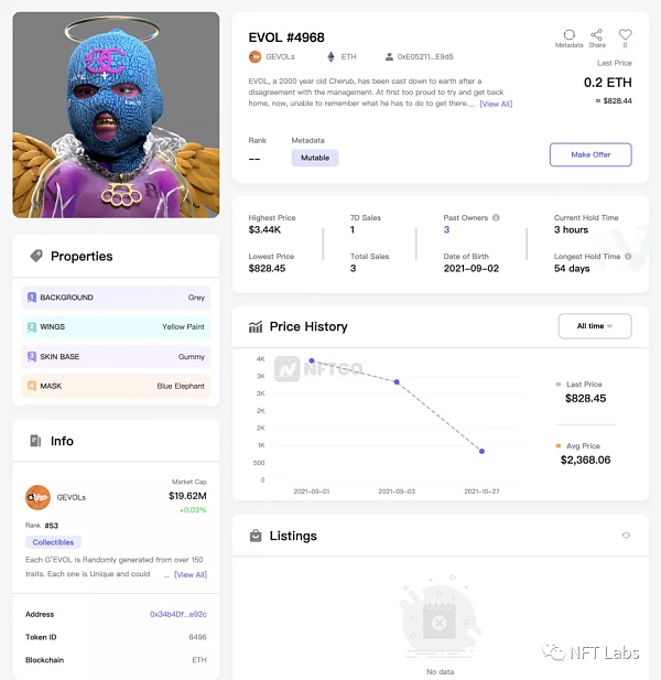 以巨鯨購買行為為例,如下圖,可以直觀的看到哪一個巨鯨購買了哪一系列的NFT以及價格和Gas,其中EVOL#4968的價格比較低,點擊“EVOL#4968”查看詳情,根據該NFT交易記錄我們知道,EVOL#4968在2021-9-1以來一直在下跌,由此推測該巨鯨可能認為到了一個比較合適的買點,當然最終做決策還要結合該項目的整體數據情況。