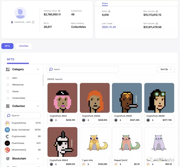 另外,巨鯨的活動所傳達的信息也因人而異,一位短線交易居多的巨鯨和價值持有者巨鯨同時在某一時間點大量拋出某一個系列的NFT,或甚至在虧損狀態出售,后者更應該引起你的警覺;購買行為同理,同樣的行為由不同交易風格的巨鯨做,所傳達出來的信息不一樣,因此,如果nftgo.io后續可以推出為巨鯨地址打標的功能,那么追蹤過程會更加的方便和精準。