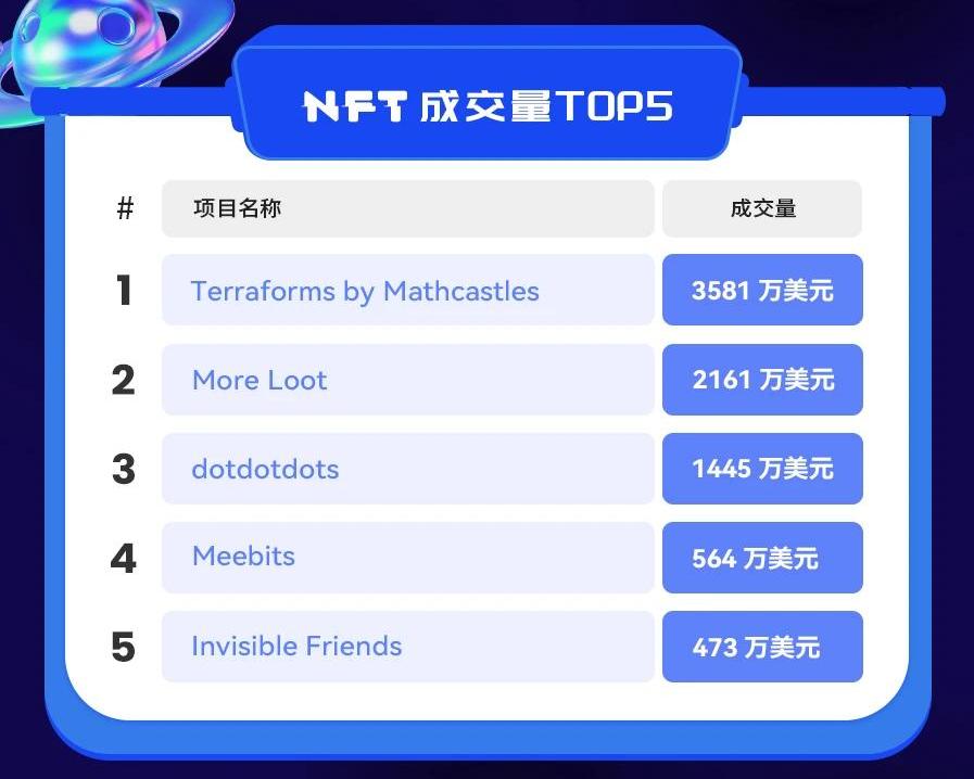 按過去24小時成交量,排名前五的項目分別為TerraformsbyMathcastles、MoreLoot、dotdotdots、Meebits和InvisibleFriends。