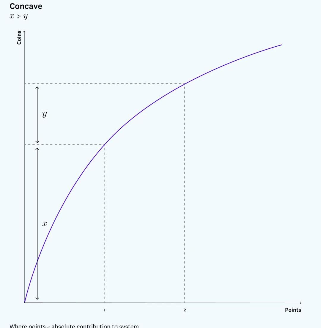當金幣與積分關系呈上凸函數時則與之相反。在這種情況下,點0至點1的紅利增長大于點1至點2的紅利增長。這種方法非常適合吸引新用戶,因為它對初始貢獻的獎勵多于后續貢獻,無論是你的第二次、第三次還是第二十七次貢獻。然而,如果用戶是匿名的,分配關系呈凹形函數的系統更難維持,因為在這種情況下,用戶可以創建許多賬戶以賺取“早期”積分。