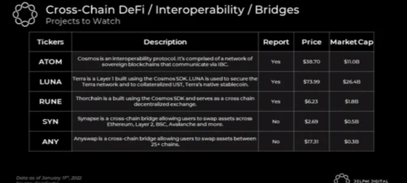上表可看出一些跨鏈橋的TVL自9月以來急劇上升,目前約90億美元,自9月1日到2022年1月初,這組跨鏈橋的平均回報率為108%,而ETH的回報率為-1%,標志著在去年下半年替代L1的起飛,且表現相當強勁。下面是DelphiDigital分析師列出的一些跨鏈橋:HopBridge(Hop):Hop是跨Rollup開發方面的先驅,雖然目前TVL約1億美元相對較小,但該協議還沒有推出Token,HopBridge將成為以以太坊為中心的Rollup的一個基本組成部分。THORChain(RUNE):THORChain最重要的里程碑是引入了資金庫節點,讓社區能夠在Rune中結合,為網絡的安全作出貢獻。這過來將允許資金池增長而不受上限限制。Synapse(SYN):Synapse連接不同的L1和L2,SYN自9月推出以來表現超過了大多數其它L1,但比SOL、LUNA、AVAX等的風險更大。Cosmos:在L1和L2的擴容之戰下,跨鏈流動性橋將成為間接的受益者。Cosmos應該在多鏈的未來大放異彩,越來越多的鏈和協議使用他們的基礎設施和IBC。