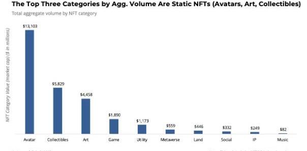 頭部NFT類型將隨著NFT市場的發展持續擴張,例如藝術類NFT。與市值高達1.7萬億美元的全球藝術市場相比,藝術類NFT市場宛如冰山一角。與此同時,收藏品等類型的NFT將隨著時間的推移日漸沉寂,而具有實用性的NFT則將脫穎而出,包括成員資格和現金流等其他認購權益。目前,NFT行業的交易額累計已超過280億美元。隨著新人源源不斷地涌入,越來越多的公司利用現有IP或推出新IP發行非同質化Token,這一行業仍將持續繁榮。與上圖相似,頭像、藝術和收藏品類NFT占據交易量大頭。但更重要的是,從根本上看,這些NFT都是靜態NFT,這意味著它們除了代表相應資產的所有權和Discord訪問權外,絕大多數都無法提供額外的實用價值。盡管靜態NFT十分珍貴,但是隨著投資者逐漸傾向于追求通過所持資產獲得更優質的體驗,人們對非靜態NFT的需求將不斷攀升,主要包括游戲資產、實用資產和音樂類NFT等。