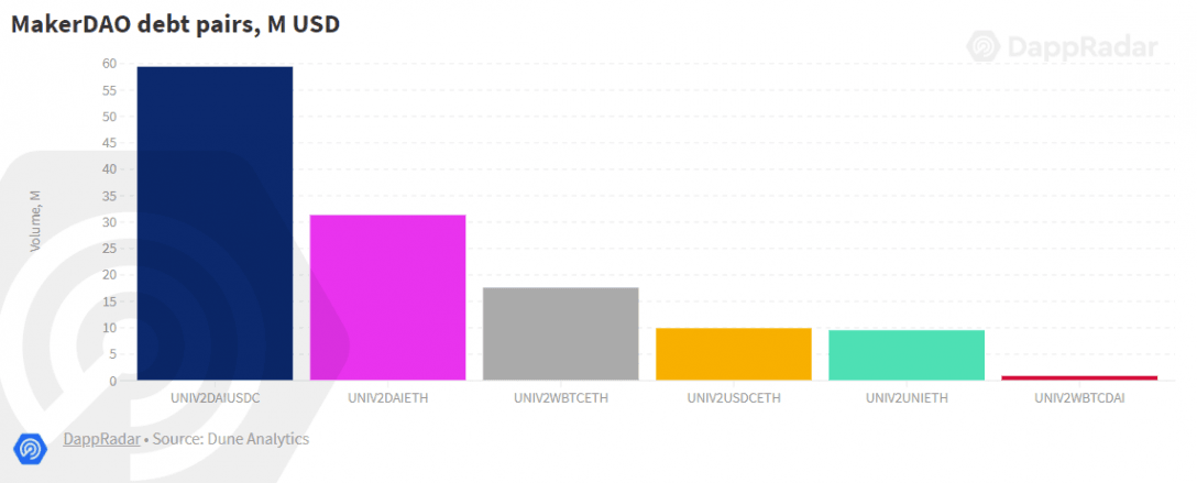 與其他借貸Dapp不同,Maker不接受借貸交易。在Maker中,用戶只能通過在接受的加密貨幣中存入抵押品或使用接受的代幣創建新的保險庫來借入DAI。最受歡迎的債務對包括Uniswap中提供的流動性對,這也有助于突出領先的DeFi協議之間存在的交互。