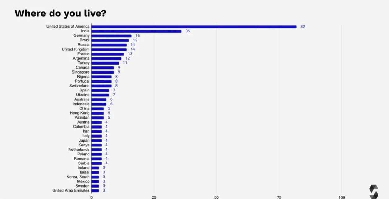 超過20%的人表示居住在美國,其次是印度和德國,大約9%的人更愿意不分享其位置的詳細信息。
