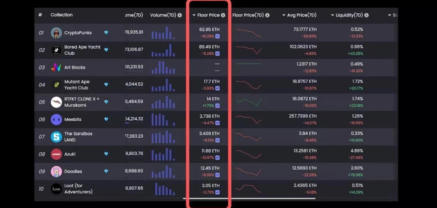 數據來源:coinmarketcap同樣的趨勢也出現在NFT市場中。在所有前10名的收藏品中,MAYC的跌幅最低,為2.83%,CryptoPunks的跌幅最高,超過16.29%。