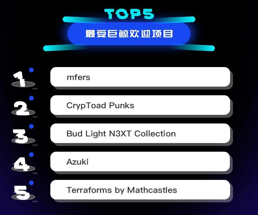 最受巨鯨歡迎項目排前五的分別是:mfers、CrypToadPunks、BudLightN3XTCollection、Azuki和TerraformsbyMathcastles。