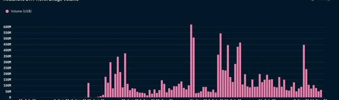 在多鏈的未來中,L1甚至L2的一個重要特征是可訪問性。用戶能夠快速、安全且低成本地將代幣從一個區塊鏈轉移到另一個區塊鏈非常重要。這可以通過所謂的區塊鏈橋來完成,這是一種允許將代幣或任意數據從一個鏈傳輸到另一個鏈的連接,從而實現網絡之間的互操作性。對于ERC20代幣從以太坊到Avalanche的C-Chain的轉移,用戶可以使用AvalancheBridge。它是一個去信任的橋梁,支持多種ERC-20代幣,最著名的是WETH、USDC和WBTC。轉賬總共需要10-15分鐘,費用低3美元。可以在此處找到有關費用和其他常見問題解答的更多詳細信息。可以在NansenDashboards上監控雪崩橋梁活動。在Avalanche基金會在8月中旬宣布180毫米的DeFi之后,我們看到AvalancheBridge的交易量激增,僅在8月27日就達到了超過370毫米的交易量。隨著更多dApp的推出,以及有信譽的風險投資公司和流動性挖掘計劃的支持,Avalanche越來越受歡迎-橋上的活動繼續增長并保持高容量,在9月23日達到頂峰體積超過600毫米。Avalanche橋接交易量