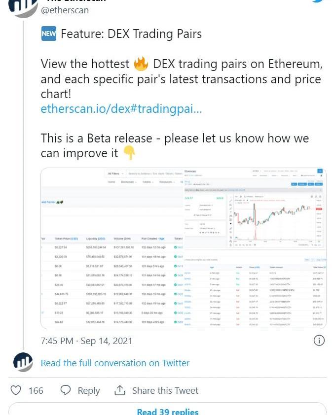 一開始,Etherscan的DEX追蹤器(DEXTracker)只是列出了以太坊上完成的DEX交易。9月,我們添加了DEX交易對信息以擴展DEX追蹤器的功能,用戶可以看到SushiSwap或Uniswapv2和v3上任何ERC-20代幣的交易對信息和價格走勢圖。