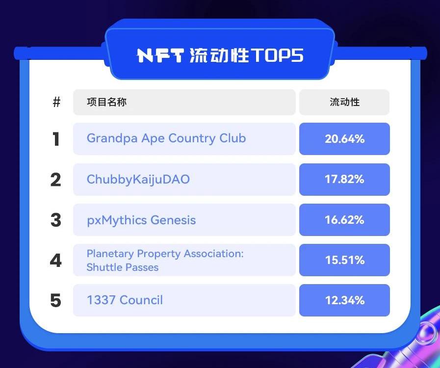按過去24小時流動性指標,排名前五的項目分別為GrandpaApeCountryClub、ChubbyKaijuDAO、pxMythicsGenesis、PlanetaryPropertyAssociation:ShuttlePasses和1337Council。
