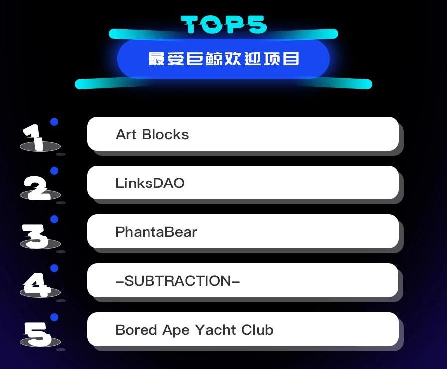 最受巨鯨歡迎項目排前五的分別是:ArtBlocks、LinksDAO、PhantaBear、-SUBTRACTION-和BoredApeYachtClub。