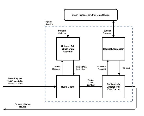 路由緩存由最常請求的路由的結果組成,其生存時間 (TTL) 與數據源的定期更新頻率相關。例如,如果之前請求過WETH和DAI之間的一條路由,則可以在路由緩存中以可能路由數組的形式找到圖遍歷的結果:[WETH -> USDC -> DAI, WETH -> WBTC -> DAI,…]。與代幣價格和儲備等對數據不同,路由可能性——特別是配對的存在——變化較少,因此該緩存的TTL預期要比對數據緩存大得多。此外,該組件還可以擴展為包含對死路由(即過期或已被取代的令牌地址或非流動對)的試探法。