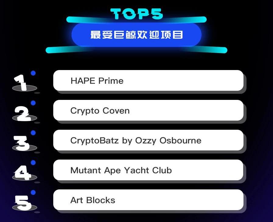 最受巨鯨歡迎項目排前五的分別是:HAPEPrime、CryptoCoven、CryptoBatzbyOzzyOsbourne、MutantApeYachtClub和ArtBlocks。