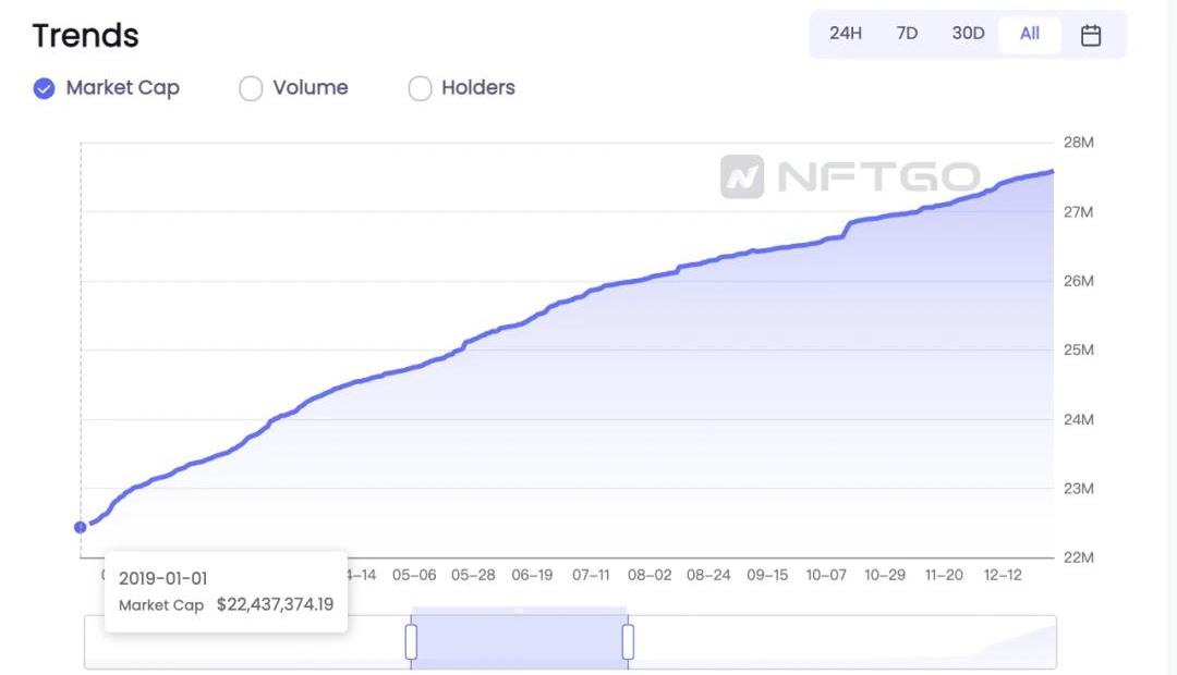 NFT市值數據來源:nftgo.io根據nftgo.io的數據顯示,2019年1月1日至2019年12月31日,NFT市值從2244萬美金增長至2759萬美金,年增長率為23%。
