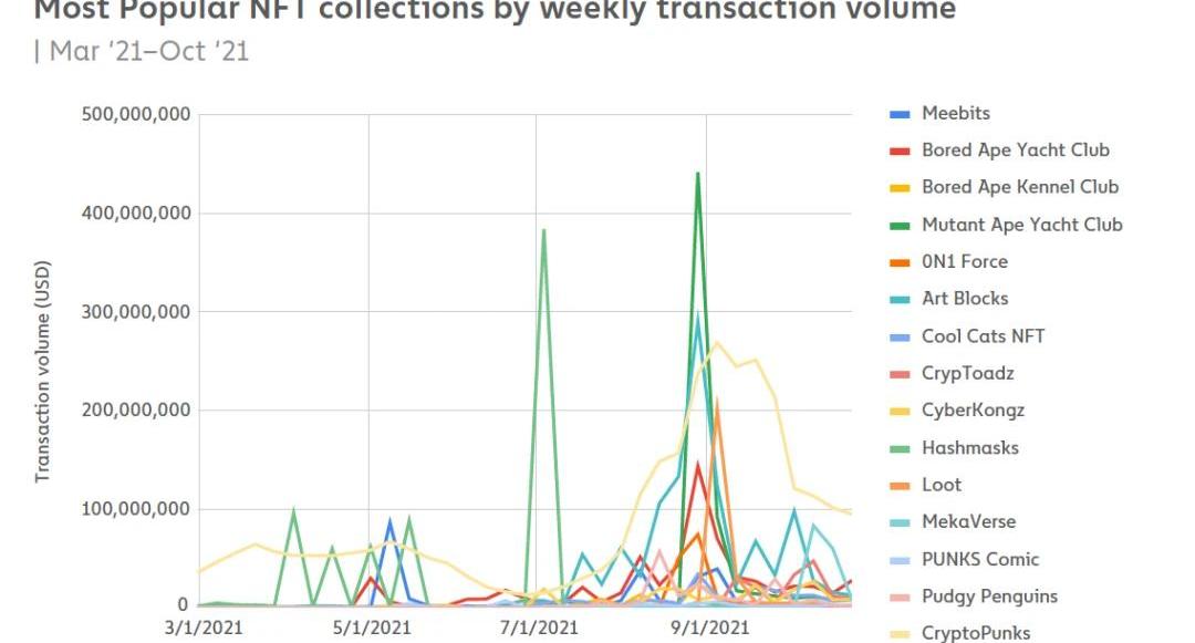 到目前為止,Ethereum上NFT銷售額在2021年已超過90億美元,比2020年的總銷售額增長了2500%。2021年作為NFT元年,同時出現在牛市周期的背景下,NFT市場的規模呈現驚人的增長趨勢,市值超百億美金。