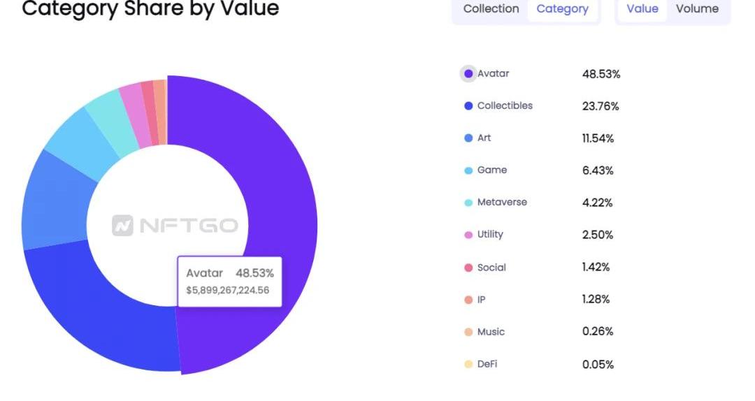 -不同種類的NFT市值占比數據來源:nftgo.io-根據nftgo.io,NFT分為十個種類,分別為Avatar,Collectibles,Art,Game,Metaverse,Utility,IP,Social,Music和Defi,截止2021年12月29日,以上十個類別的占比分別為48.53%,23.76%,11.54%,6.43%,4.22%,2.5%,1.42%,1.28%,0.26%和0.05%。Avatar一騎絕塵,約占NFT市場一半的市值,總計接近60億美金。Collectibles占比緊隨其后,前三類別的NFT市值占比超八成。