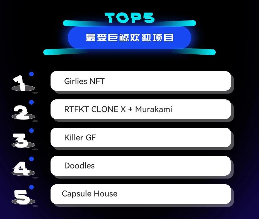 最受巨鯨歡迎項目排前五的分別是:GirliesNFT、RTFKTCLONEX+Murakami、KillerGF、Doodles和CapsuleHouse。