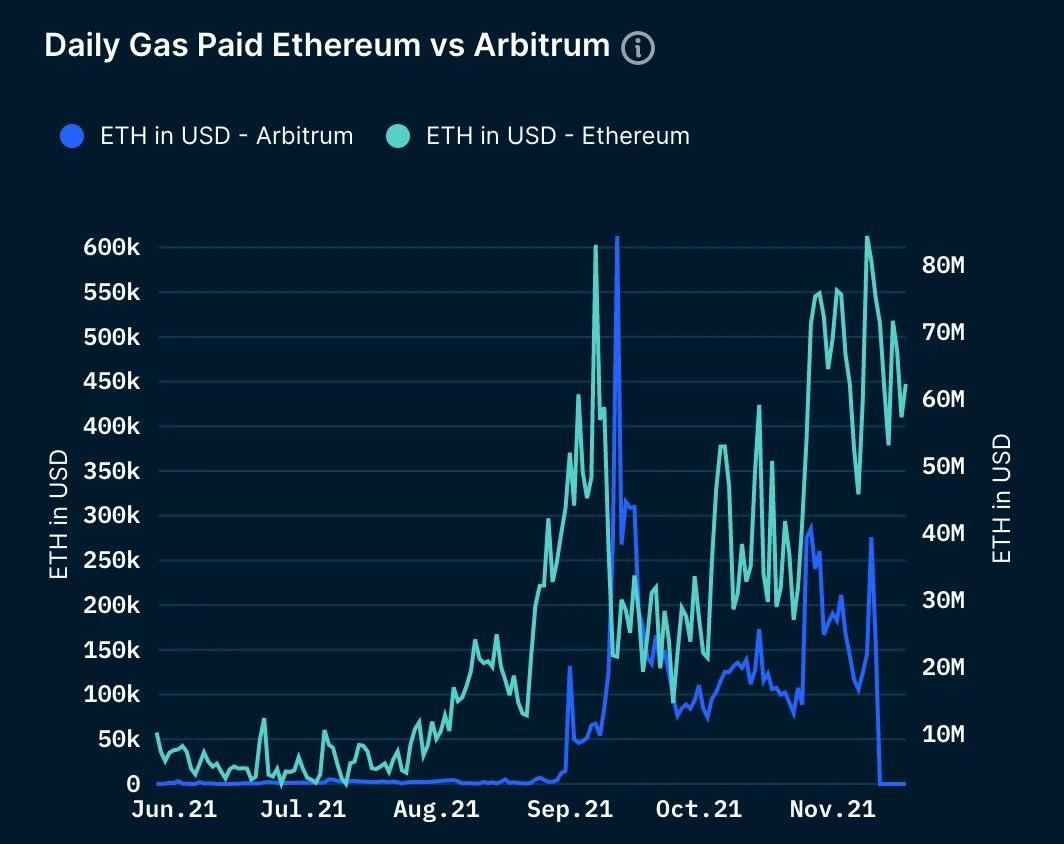 在一段時間內Arbitrum上的每日交易總額在處理能力方面,Arbitrum應該可以實現40000個TPS,與使用以太坊底層擴展相比,有5倍的平均成本優勢。除此之外,Arbitrum實際上正在努力將費用進一步降低90%-95%,這意味著你只需花幾十美分就能鑄造一個NFT或轉移eth。在Arbitrum上每天花費的gas費總額也一直低于以太坊。而9月12日的明顯飆升則是由于一個名為ArbiNYAN的第2層擴展流動性挖礦平臺的推出。