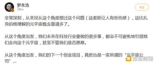 文中寫道:非常深刻,從來沒從這個角度想過這個問題(這差距讓人有些傷感),這比扎克伯格理解的元宇宙概念靠譜多了。