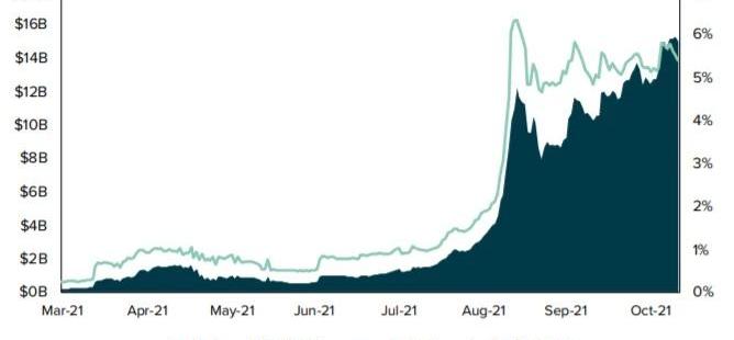 在過去一年中,SolanaDeFi協議的總鎖倉量(TVL)所上升,目前已經占到所有加密項目總鎖定量(TVL)的6%左右,取得這樣的成績主要歸功于用戶對Solana日益增長的興趣、不斷增加的應用程序、強勁的SOL網絡性能以及Solana鏈上數字美元發行量增加。圖6:SOLANA鏈上總鎖倉量,以及SOLANA鎖倉量在加密貨幣總鎖倉量中占比變化趨勢