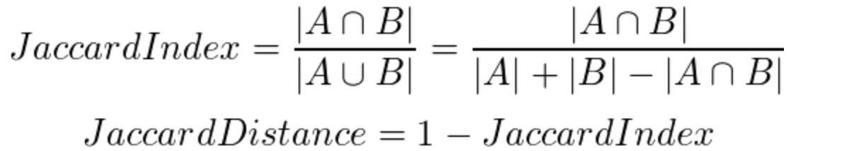 Jaccard距離是一個統計學的方法,用于測試樣本集之間的不相似性,范圍為從0到1。其數學公式為: