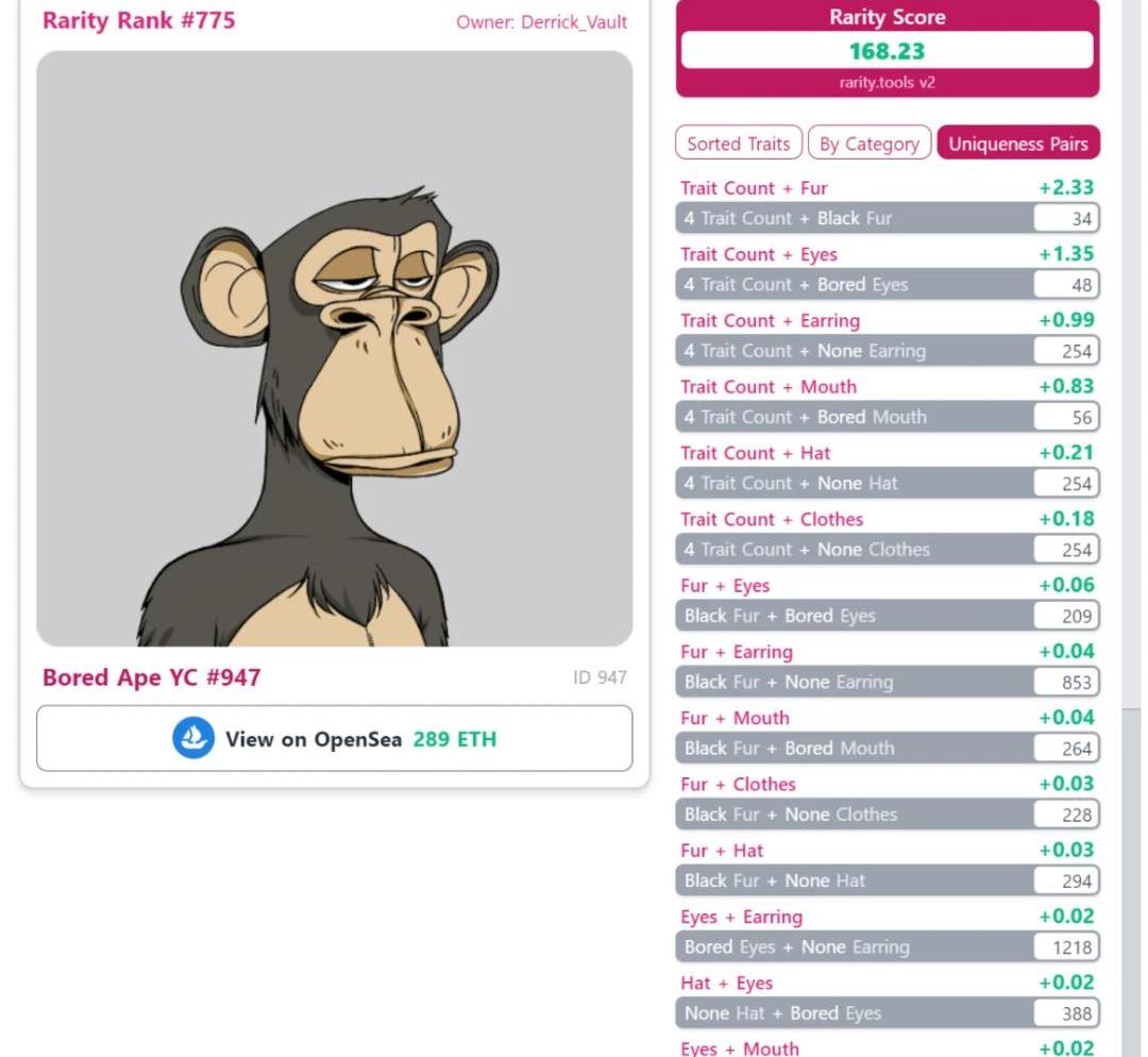 圖4:Rarity.tools針對BAYC#947的稀有度評分細節