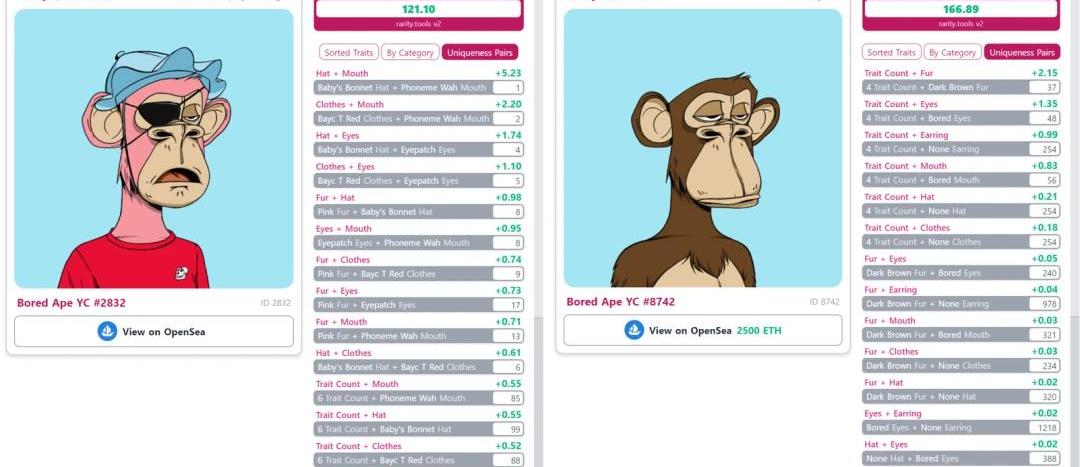 圖6:Rarity.tools針對BAYC#2832和BAYC#8742的稀有度評分細節
