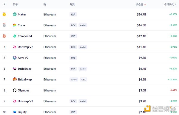 DeFi項目鎖定資產前十排名及鎖倉量,數據來源:Debank