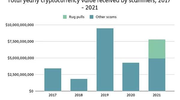 Rugpulls已成為DeFi生態系統的最大騙局類型,占2021年所有加密貨幣騙局收入的37%,而在2020年僅占1%。