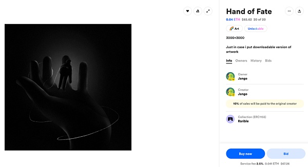 第二步:當你登入之后,在 Rarible 平臺上搜索你想要購買的 NFT。在我們的例子中,我們將展示如何購買藝術家 Jango 創作的「Hand of Fate」NFT 作品 (如下圖所示)。無論你想要購買哪個 NFT (假設該 NFT 可以直接購買),這個購買過程都是類似的。一旦你選好了想要購買的 NFT,點擊「Buy now」(現在購買) 按鈕即可購買。