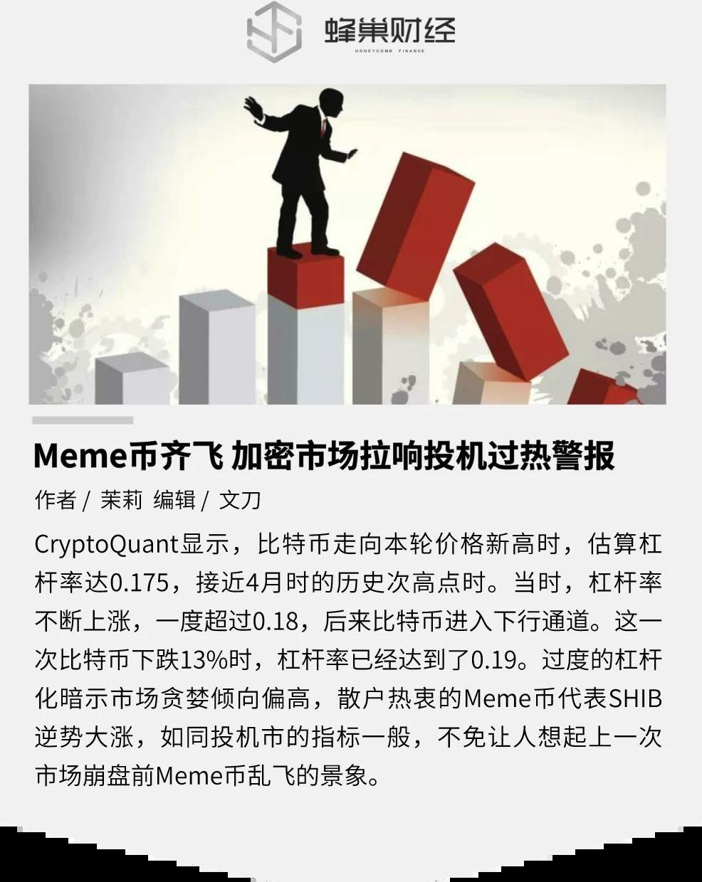 當前比特幣市場的估算杠桿率達0.19「估算杠桿率」的計算方式是將所有交易所的期貨未平倉量除以交易所的比特幣儲備,其中,未平倉合約數是一個交易周期結束時仍未清算的合約數量,它是流動性的最主要指標;而自7月以來,交易所的比特幣儲備量處于持續下降中。該比率實質上顯示了普通投資者的杠桿程度。從歷史比特幣估算杠桿率看,在價格上行到一定階段時,杠桿率過高時,往往意味著價格見頂。CryptoQuant的歷史數據顯示,比特幣走向本輪價格新高67000美元附近時,估算杠桿率為0.175,這和4月時的歷史次高點時接近,當時,杠桿率不斷上漲,一度超過0.18,此后比特幣進入下行通道。這一次,比特幣下跌13%時,杠桿率已經達到了0.19。CryptoQuant首席執行官KiYoungJu也在接受Coindesk的采訪時表示,現在市場顯然被過度杠桿化了,「我們很快就會看到一些波動,以及大量清算。」放大到金融市場的普遍意義中,杠桿率一般是指資產負債表中總資產與權益資本的比率。高杠桿率意味著在經濟繁榮階段,杠桿帶來的流動性刺激下,金融資產能夠獲得較高的權益收益率;但當市場發生逆轉時,流動性不足,過度杠桿率將會面臨收益大幅下降的風險。從這個普遍意義看,本輪的比特幣上漲不排除也有高杠桿的影響,這或許暗示了支撐上漲本身的資金體量并沒有預期中那么龐大,上行空間有限。投機過熱SHIB領漲Meme板塊