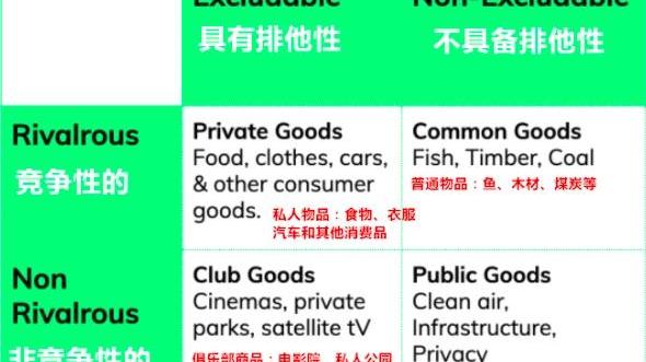 在經濟學術語中,公共物品指的是任何具有非排他性和非競爭性的東西。當某樣東西是非排他性的,它意味著要阻止某人使用該物品是非常困難的,例如清潔的水、道路或公共公園。非排他性意味著它是豐富的,一個人對該物品的使用不會大大減少留給其他人的數量。例如,如果一個國家有干凈的空氣,它不能阻止一些公民呼吸它,一個公民呼吸干凈的空氣不會奪走另一個公民的空氣,因此,向一個公民提供干凈的清潔空氣的成本與向所有公民提供的成本是一樣的。