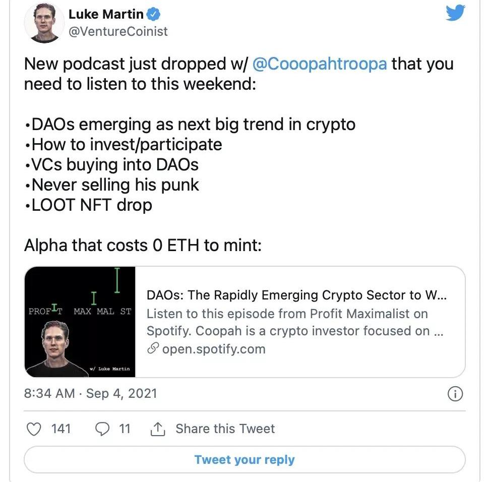 DAO可能不會看到重大資本輪換的另一個原因是,從許多指標來看,DAO超級周期已經在進行中——它可能不會出現在CoinGecko的排名中。許多早期的DAO參與者——經歷了早期實驗的MolochDAO“召喚者”和MetaCartel捐贈者——目前正在蓬勃發展,同樣催生了整個項目的家譜。Soleimani說:“很多經歷過這件事的人都處于浪潮的頂端,他們已經能夠繼續建立做其他事情的社區。”“以ConsenSys的Eth2.0開發人員JosephDelong為例,他自愿加入MolochDAO,拿出自己的100ETH來資助Eth2.0的開發——那是他自己的東西。現在他在領導層。”Delong目前是去中心化金融平臺Sushi的CTO,這一職位使他在社區中具有重要影響力。同樣,Soleimani自豪地談到Cooper“Cooopahtroopa”Turley,MolochDAO曾花錢請他寫一篇年終博文。正如Soleimani所說,Turley已經成為一名全職的“DAO領主”——FireEyes和FriendsWithBenefits等團體的關鍵人物。這是一種不常見的投資形式,甚至可能更接近于網絡——將財政和社會資本借給一個組織,然后才通過出現的機會獲得回報。反過來,這些機會也擴展了DAO生態系統。Warren和Soleimani都指出,DAO成員通常會繼續組建新組織,該組織可能具有不同的使命、目的和需求——這些需求促使對DAO基礎設施進行新的投資。Soleimani說:“這些人會遇到需要花錢解決的問題。”尋求被動部署資本的投資者最終將無法趕上這一趨勢;只有內部的人才能感知到變化和循環。投資者玩法