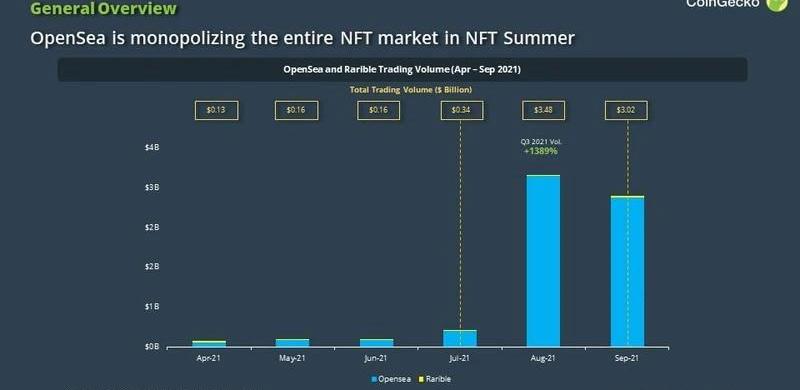 在2021年第三季度,游戲代幣占據了榜單。在回報率方面,AxisInfinity優于其它加密貨幣,3個月回報率為965%,年初至今收益為13783%。其次是Gala和Illuvium,3個月的回報率分別為1051%和599%。在CEX代幣方面,FTX代幣代幣以87%的回報率引領第三季度。大多數頂級CEX代幣在第二季度虧損。所有前5名的CEX代幣在第三季度都有正回報。同樣,排名前5位的DEX代幣在第三季度也有正回報,全線上漲2%至36%。THORChain在第二季度遭受多次攻擊后只恢復了2%。不過,PancakeSwap今年迄今仍上漲2954%。LUNA在第三季度公布了最好的3個月回報率,而其他DeFi代幣的正回報率在10%-36%之間。4.在NFT熱夏,OpenSea壟斷了整個NFT市場