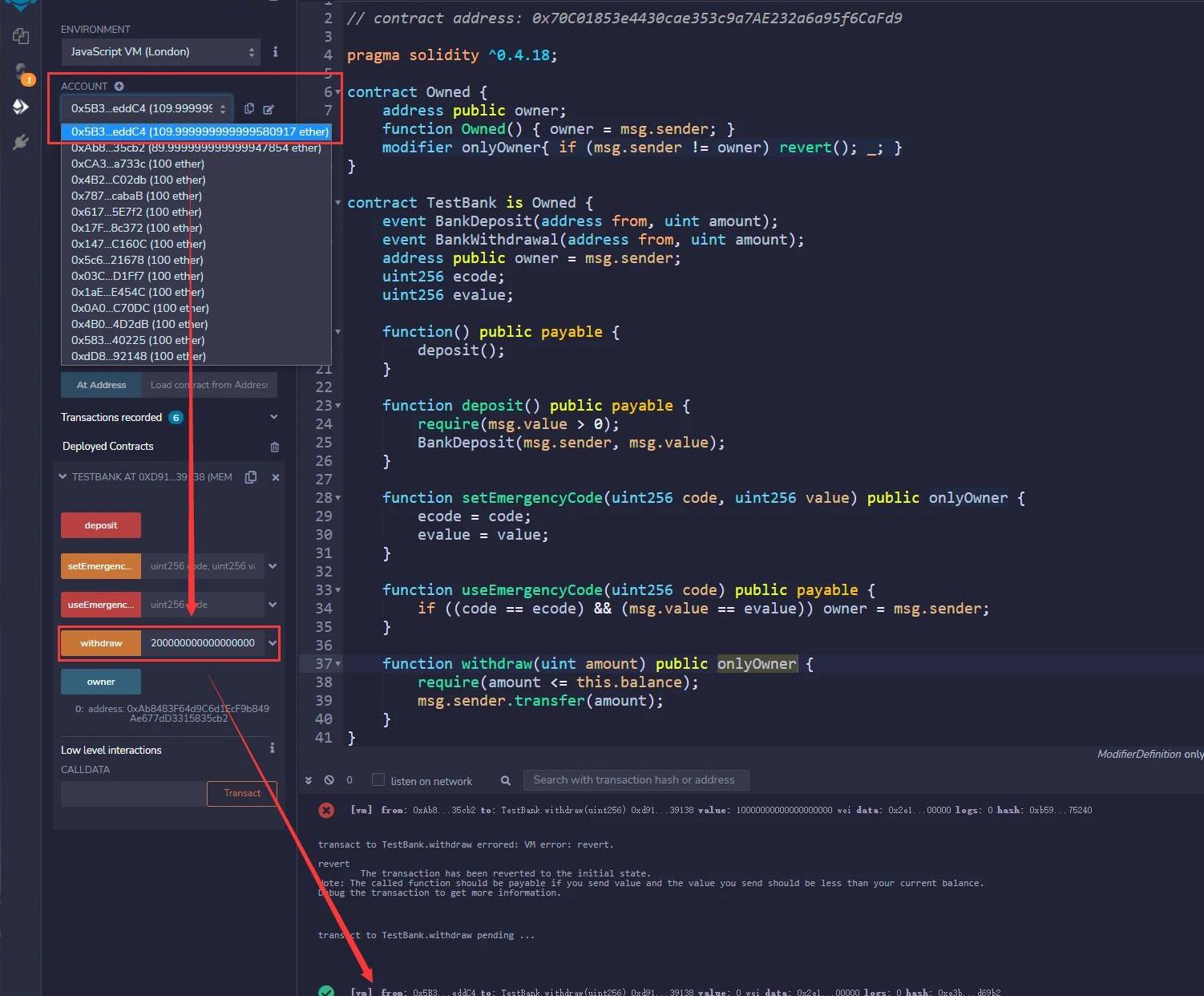 攻擊者0xAb8查看owner的值確定自己就是合約的所有者了,之后調用withdraw()函數去提取合約中所有的20eth,會發現調用失敗,這是因為函數修飾器onlyOwner中判斷條件不能通過,導致withdraw()函數也不能正常執行,這樣一來攻擊者0xAb8就被蜜罐合約白白騙取了10eth。
