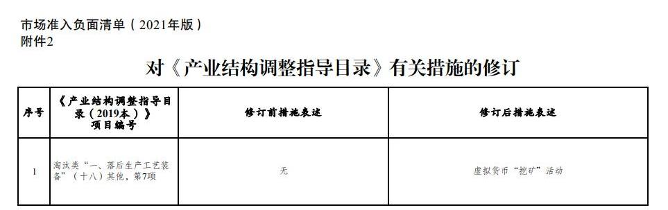 9月24日,國家發改委等11部門發布《關于整治虛擬貨幣“挖礦”活動的通知》稱,嚴禁新增虛擬貨幣“挖礦”項目,加快存量項目有序退出。同時,《通知》也預告,將“虛擬貨幣‘挖礦’活動”增補列入《產業結構調整指導目錄》“淘汰類”。在增補列入前,將虛擬貨幣“挖礦”項目視同淘汰類產業處理,按照《國務院關于發布實施的決定》有關規定禁止投資。9月30日,經國務院同意,發改委會同中央宣傳部等11個部門聯合印發《關于整治虛擬貨幣“挖礦”活動的通知》,相關文件均提出將虛擬貨幣“挖礦”活動增補列入《產業結構調整指導目錄》“淘汰類”,為《目錄》增補提供了政策依據。《目錄》增補的主要考慮為,虛擬貨幣“挖礦”活動指通過專用“礦機”計算生產虛擬貨幣的過程,能源消耗和碳排放量大,對國民經濟貢獻度低,對產業發展、科技進步等帶動作用有限,加之虛擬貨幣生產、交易環節衍生的風險越發突出,其盲目無序發展對推動經濟社會高質量發展和節能減排帶來不利影響。10月8日,國家發展改革委就《市場準入負面清單》向社會公開征求意見,其中提到對《產業結構調整指導目錄》有關措施的修訂,擬將虛擬貨幣“挖礦”活動納入淘汰類產業。