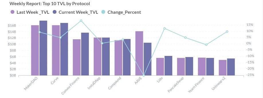 前10公鏈TVL數據來源:FootprintAnalytics從類別上劃分,第一為DEX類,TVL為738.9億美元,本周上升5.9%。各協議中,TVL最高的為MakerDAO,本周上漲8.95%;第二為Curve,本周上漲4.57%。