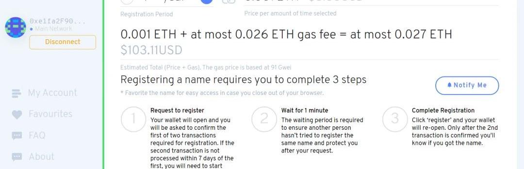 接下來我們以ENS為主要對象,通過實際的注冊、反解析、使用等流程,來和大家一起詳細了解下去中心化域名的特色、相對優勢及在WEB3時代可能扮演的角色定位。比如,xxxxx.eth的域名,具體注冊分為以下三步:首先,我們需要在錢包中確認一筆交易,這是完成域名注冊所需的兩筆交易中的第一筆,如果第1步完成之后的24小時內沒有進行第2步,則需要從第1步重新開始。