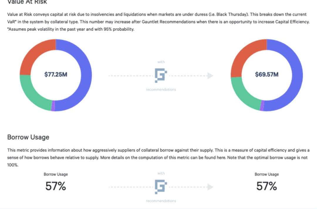 首先,現在有許多量化工具已經出現在市場中,它們可以讓社區將DAO(可能還有相關的協議)中的風險可視化并結合市場環境形成函數。例如,讓DAO成員理解降低抵押物/保證金標準或提高利率等提案對于協議來說意味著什么。這為DAO的金庫所存在的風險提高了整體透明度,并允許社區更新金庫中的組成部分以滿足特定的KPI。例如,借貸協議Aave和Compound中所持有的數十億美元資產,可有效充當借貸協議的保險支撐。例如,如果發生較大的價格震蕩,導致大量貸款違約,并造成貸款人在協議中遭受損失,這些DAO可以可使用金庫來進行補償(例如,Compound協議中的DAI清算事件)。調整協議中例如保證金要求等參數,有助于減少DAO不得不在突發事件中花費金庫資金的可能性。下面是一個實時儀表盤,用于監測不同Aave市場的風險。(信息披露:我是提供這些服務的應用Gauntlet的創始人和首席執行官)。用于量化風險的工具中包括結合算法交易和人工智能(例如AlphaGo)的模擬工具。
