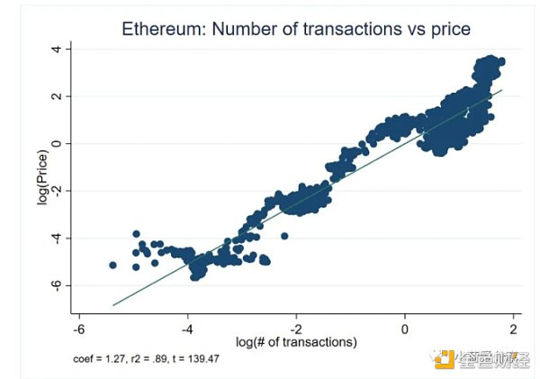 TVL 的增長反映了經濟中金融部門的增長。當然,這些都不是完美的措施,但關鍵是它們與平臺上產生的額外經濟產出呈正相關。實際數據證實了這些變量和 代幣/美元 匯率之間的關系。交易量的增長與ETH 的價格增長呈近乎線性的相關性,從歷史數據來看:交易量增長 10%,價格平均增長 13%。