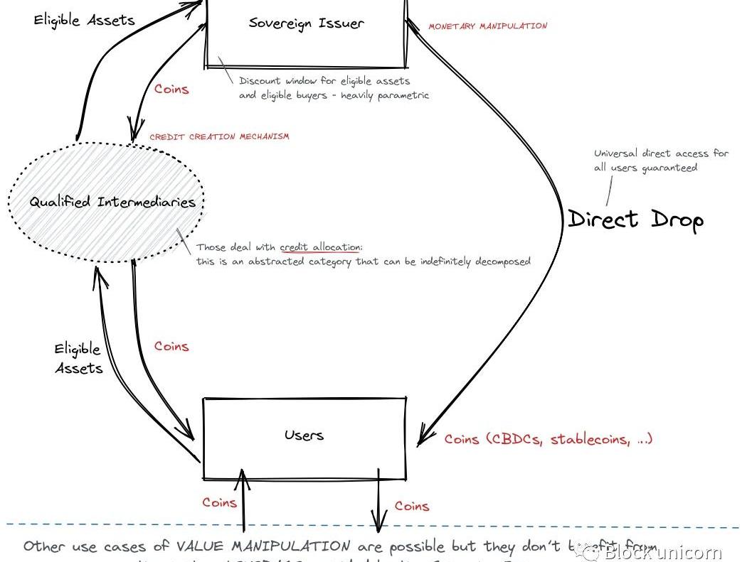 一個主權發行某種形式的很可能仍坐在貨幣食物鏈的頂端。此類發行人將是唯一的貨幣當局,與主權社區相關聯,控制一組支持貨幣供應的有形和無形資產。發行人可以通過兩種不同的方式向用戶分發和分配硬幣:將這些代幣直接投放給用戶——基于一組參數化決策通過一組合格的中介分配額外的硬幣機制→權威機構根據自己的決策機制決定向社區成員空投硬幣。用CBDC的術語來說,這相當于允許所有公民在中央銀行開設一個賬戶,在那里存入和查看他們的代幣。鑒于主權者和使用者之間的直接聯系,機制既包含傳統的貨幣分配功能,也包含貨幣分配功能。在主權發行人選擇保留對貨幣分配的完全控制的情況下,僅機制(1)就足以使系統完整。機制(2)→然而,集中的貨幣分配是一頭難以馴服的野獸。由于操作復雜和信息不對稱,它很容易出現效率低下和道德風險。想象一個中央機構決定向誰提供資金、金額和期限,您已經可以開始想象系統無法運行的一長串原因了。這就是為什么如機制(2)中所述,通過一系列合格的中介機構采取行動會有所幫助。這在某種程度上類似于今天通過商業銀行部門在特許經營系統中發生的情況。然而,不同之處在于這將如何發生。與特許經營體系中的角色相比,信用中介將失去對客戶存款的壟斷;因此,它們的功能將僅僅成為合格信貸資產的聚合和傳遞。有資格由新印的貨幣集中資助,通過這種方式,主權發行人將把識別和定價良好信用的大部分繁重工作委托給中介機構,同時保留對所有資格參數的完全控制。我們可以看到,在這種新配置中,主權發行人將如何在不影響效率的情況下增強對貨幣操縱和貨幣分配的控制和可見性。但主權發行人不應保留對所鑄造硬幣使用的壟斷權。以同樣的方式美元紙幣可以在未必符合美國的法律框架的方式來使用,用戶仍然可以自由地使用用例涉及操縱價值無限多的參與,而外面的主權邊界;但是,這樣做時,他們將無法從在合格生態系統中發揮作用所提供的影響力中受益。