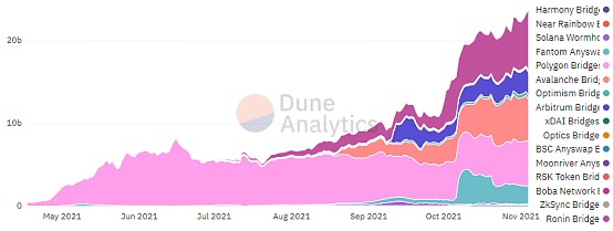 由于以太坊費用持續居高不下,越來越多的用戶將資產連接到兼容EVM (以太坊虛擬機)的低成本網絡。Dune Analytics數據顯示,自10月初以來,橋接協議的鎖定總價值一直處于上升趨勢。