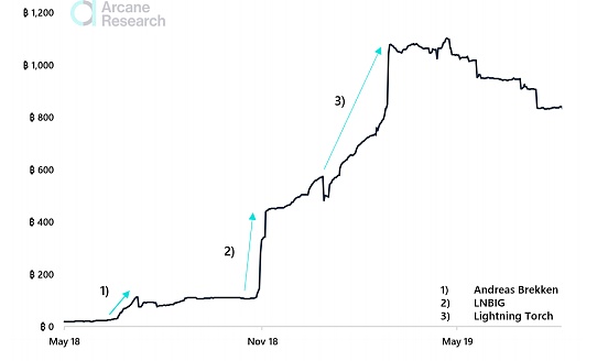 這11個月的第三個增長階段發生在2019年1月。這可以概括為一項由社區推動的努力,引導閃電網絡在比特幣社區內外獲得廣泛關注。2019年1月,推特用戶Hodlonaut開始了一項實驗,他向他信任的第一個回復推特的人發送了100000條SAT。該交易的條件是收件人添加10000個SAT,然后將其發送給新用戶。這一交易鏈被更名為“閃電火炬”,并很快在推特上引起關注。