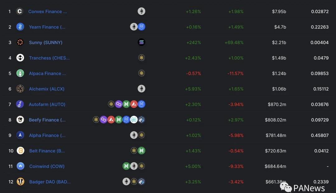 收益聚合/優化類協議往往能使提供更優秀的收益率,并自動用收益復投。除以太坊上的Convex和Yearn之外,Solana上的Sunny和BSC上的Tranchess和Alpaca也取得了不錯的市場份額。因為收益類協議中的資金通常會被存入其它協議以獲取收益,這部分TVL會被重復計算。