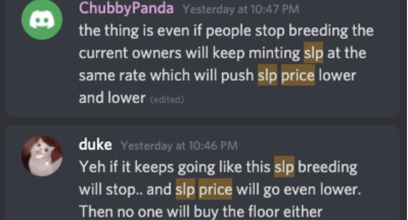 這種模式已經產生了非常大的價值--根據TokenTerminal的數據,該游戲在過去30天內產生了2.44億美元的收入,甚至在上個月一度領先于以太坊。現在,隨著SLP的鞭長莫及,這個機制中出現了一個中介--經理和玩家以SLP的形式分享贏利。隨著收益的下降,玩家們都嚇壞了。用戶myomie在AxieInfinityDiscord中說:"Omg請趕緊控制一下SLP的價格,我們需要對其進行升級"。"我希望開發者能對SLP的價格做些什么,"另一個人說。據報道,管理人員也有麻煩。"由于SLP價格下降,我這周已經損失了50個學者。"Theblender101在AxieInfinity的討論區說。其他人正在考慮是否出售他們的AxieNFT,因為SLP的獎勵并不充分。即便如此,一些經理人仍在與動蕩作斗爭。"我一點都不擔心,"Axie經理SamWithers告訴《衛報》。Withers說,有更多的SLP燃燒機制在路上。燃燒機制,如EIP-1559,在以太坊上燃燒部分交易費用,減少Token供應從而提高價格。